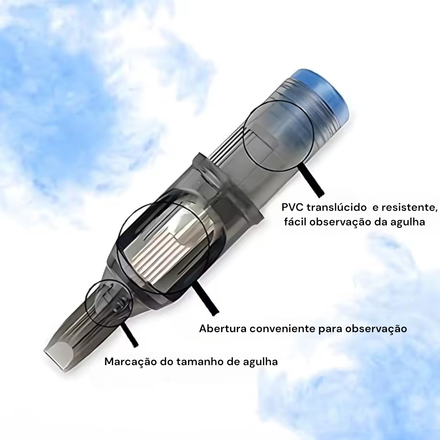 O PVC é translúcido o que facilita a visualização e observação das agulhas e interior do cartucho.