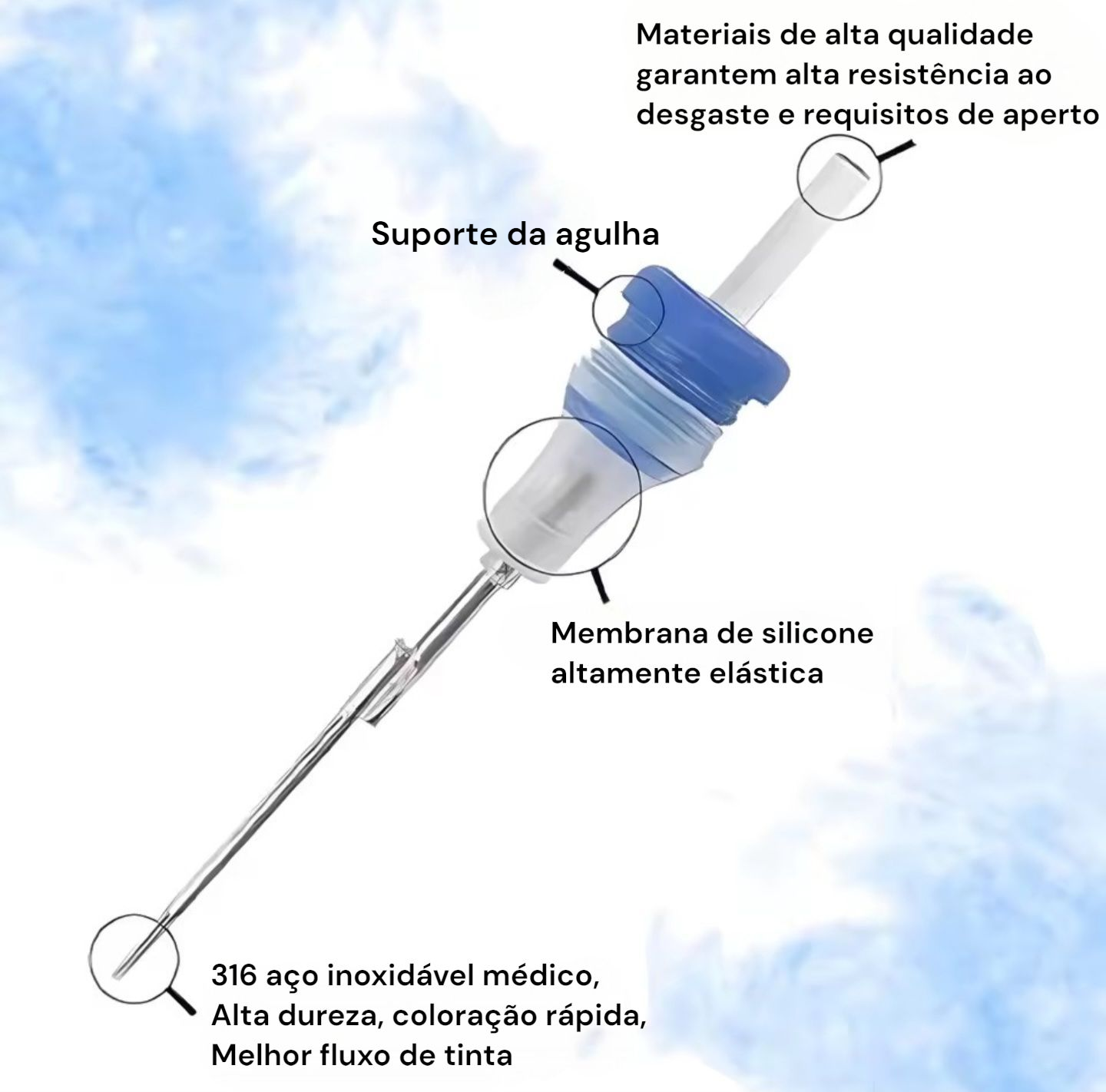 As agulhas são feitas em aço inoxidável de grau médico, de excelente dureza e polimento, que proporciona uma pigmentação rápida e um melhor fluxo de tinta.